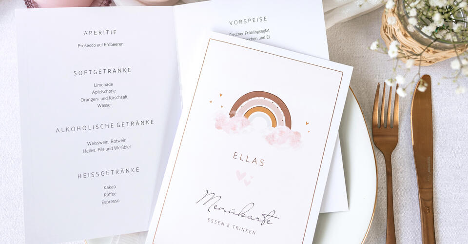 Zu einer unvergesslichen Tauffeier gehört das Festessen mit Familie, Freunden und Paten einfach dazu. Und mit liebevoll gestalteten Speise- und Getränkekarten wird die Vorfreude darauf noch größer. Wähle jetzt Dein Lieblingsdesign aus und personalisiere es {{block1}} mit den kulinarischen Highlights Deines Taufmenüs.
