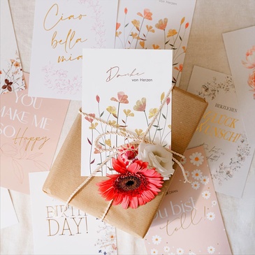 1. Wähle bis zu 3 Kartendesigns aus und gestalte sie nach Deinen Wünschen. 2. Aktiviere „kostenlose Musterkarte“ auf der jeweiligen Produktseite und lasse Dir die Karten kostenlos per Post zusenden.