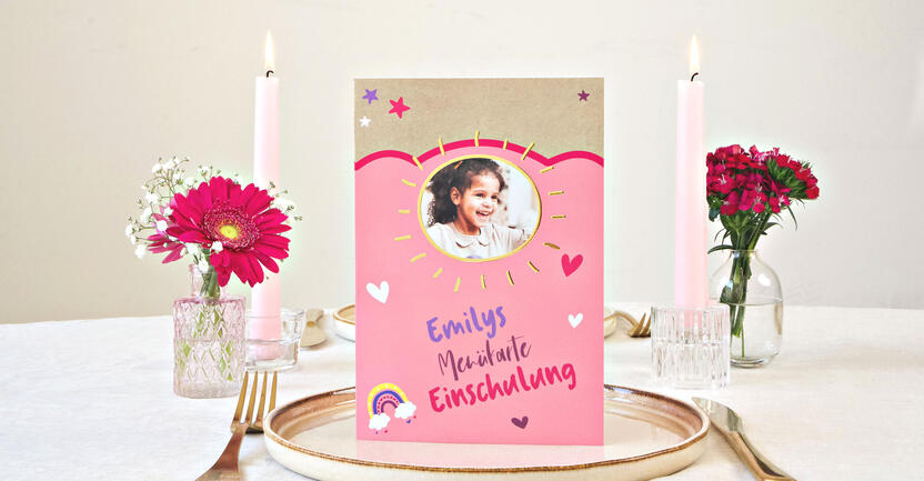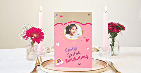 Coole Superhelden, süße Zuckertüten, kunterbunte Regenbögen: Lass Dich von unseren originellen Motiven inspirieren und gestalte online die perfekten Speise- und Getränkekarten für die Einschulungsfeier Deines Kindes.