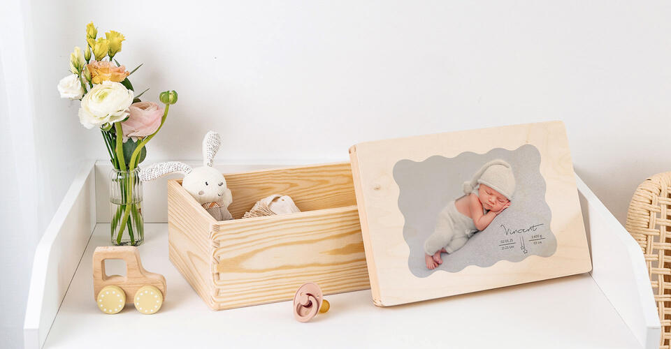 Alle unvergesslichen Momente der Babyzeit finden in dieser bezaubernden Erinnerungsbox ihren besonderen Platz. Wähle jetzt Dein Lieblingsmotiv aus, designe die Holzkiste mit Deinem persönlichen Text und Foto und verleihe ihr eine ganz individuelle Note.