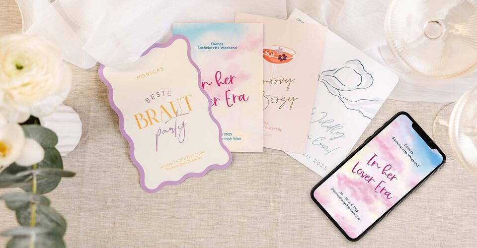Du möchtest den Gästen gern zusätzliche Informationen zum geplanten Junggesellinnenabschied zukommen lassen? Dann lege den Print-Einladungen zum Beispiel einen schicken transparenten Einleger mit allen wichtigen Details bei. Ein Fotostreifen mit lustigen Schnappschüssen von der Bride to be steigert außerdem die Vorfreude auf die anstehende Brautparty.