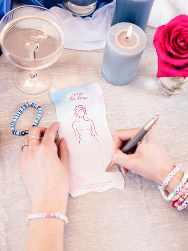 „Junggesellinnenabschiede sind für mich immer ganz besondere Feiern. Denn die einzigartige Beziehung zwischen einer angehenden Braut und ihren Freund:innen sowie die Liebe eines Brautpaars zu zelebrieren, {{block3}} für mich. Daher berührt mich auch die Textzeile „Can we always be this close forever and ever?” aus {{block5}} jedes Mal aufs Neue und hat mich zu meiner „Lover Era“-Kollektion inspiriert. Die wunderschönen Pastelltöne des Aquarell-Designs symbolisieren für mich {{block4}}.{{block1}}{{block2}}