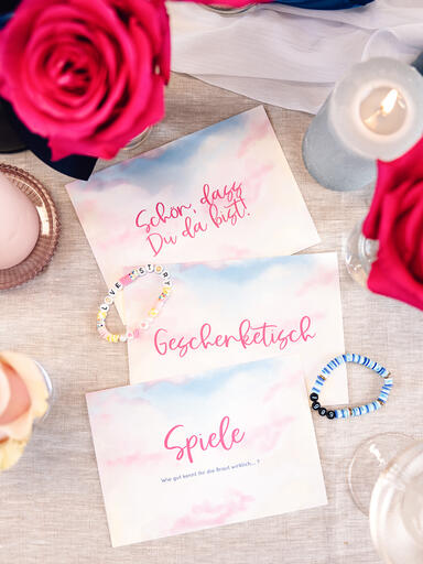 Ein Junggesellinnenabschied im „Lover Era“-Look bietet die ideale Gelegenheit, {{block2}} und die Feier in den fröhlichen und verträumten Farbtönen dieses Designs zu gestalten. Verwende dafür {{block3}} und ergänze die Tischdekoration mit eleganten Schleifen und duftenden Blumen.{{block1}}Und wie wäre es mit einer {{block4}}? Als süße Kleinigkeiten kannst Du zum Beispiel bunte Kekse und {{block5}} bereitstellen.