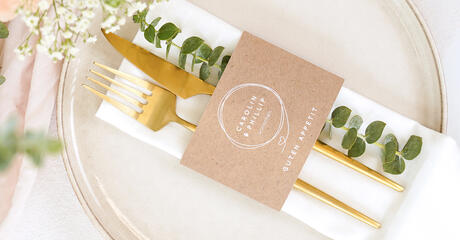 Rundet Eure Hochzeitstafel elegant ab und gestaltet Banderolen oder Anhänger in Eurem Hochzeitsdesign. Sowohl das Besteck als auch die Servietten lassen sich damit wunderschön schmücken und die einzelnen Gedecke stilvoll dekorieren.