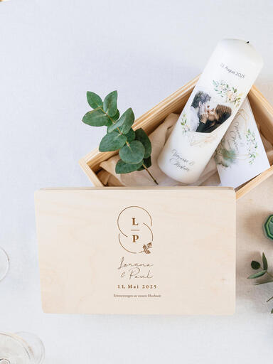 Bewahrt die schönsten Momente und Andenken an Eure Hochzeit in einer liebevoll gestalteten Erinnerungsbox für immer auf. Sucht Euch jetzt Euer Lieblingsdesign aus und erstellt online Eure individuelle Schatzkiste aus Birkenholz mit persönlichem Foto und Text.