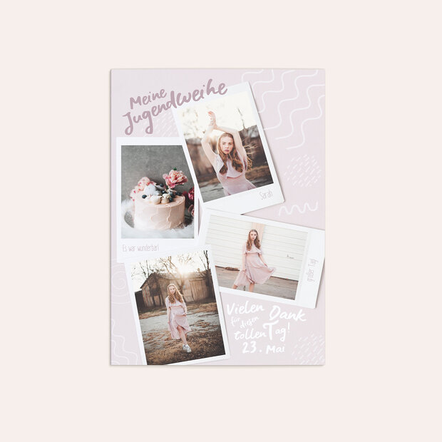 Werde kreativ und erstelle Deine Dankeskarten zur Jugendweihe online selbst. Nutze dafür unsere kostenlosen Design- sowie Textvorschläge und ersetze die einzelnen Elemente durch eigene Bilder und Worte. Als Highlight zu Deinen Karten empfehlen wir Dir das {{block1}}. Wie das genau funktioniert, erfährst Du in unseren folgenden 3 Tipps.
