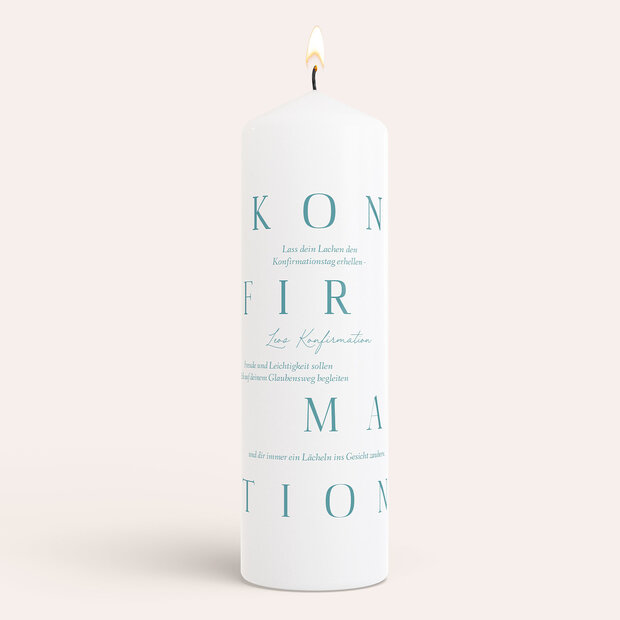 Ob als Deko für die Festtafel oder Geschenk, eine Kerze ist eine wunderschöne Idee zur Konfirmation. Wähle einfach Dein Lieblingsmotiv aus und füge im Bearbeitungsmodus statt unseren Mustertexten zum Beispiel den {{block2}} und das {{block3}} ein und passe die Schriftfarben und -arten ganz nach Deinen Wünschen an. Natürlich bieten unsere 25 cm hohen weißen Kerzen (Durchmesser 7,8 cm) auch wunderbar Platz für den {{block4}}, ein inspirierendes {{block5}} oder herzliche {{block6}}. Solltest Du weitere Textfelder benötigen, lassen sich diese über die Fläche „Neuer Text“ mit einem Klick hinzufügen und editieren.{{block1}}Verziert mit diesen kunstvollen Details wird Deine selbst gestaltete Konfirmationskerze für die Konfirmandin oder den Konfirmanden zu einem ganz persönlichen Begleiter auf dem Glaubensweg. Und dank der {{block8}} unserer {{block9}} kann Dein Liebling sie noch zu vielen weiteren festlichen Anlässen anzünden.
